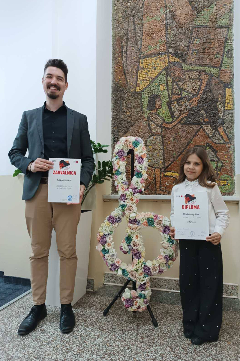 Una je nastupila u pretkategoriji i osvojila prvu nagradu sa 99,50 bodova, potvrdivši svoj talenat, predan rad i ljubav prema muzici. Mlada pijanistkinja pohađa klasu profesora Miloša Toškovića, pod čijim mentorstvom je ostvarila ovaj značajan rezultat.